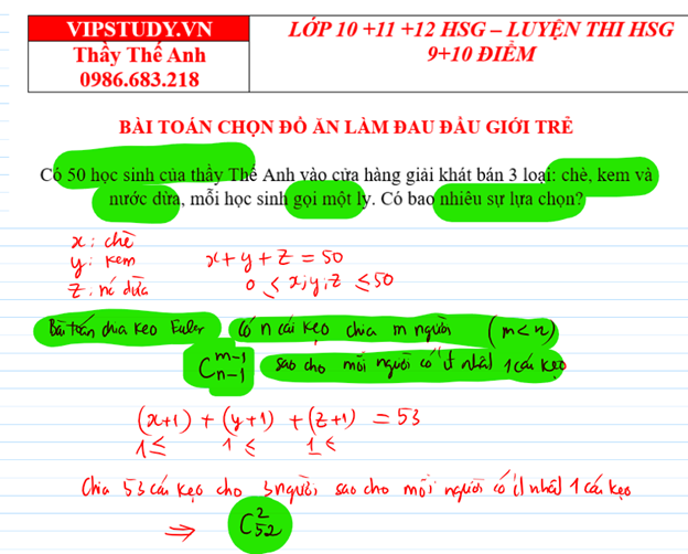 Có 50 học sinh của thầy Thế Anh vào cửa hàng giải khát bán 3 loại: chè, kem và nước dừa, mỗi học sinh gọi một ly. Có bao nhiêu sự lựa chọn?