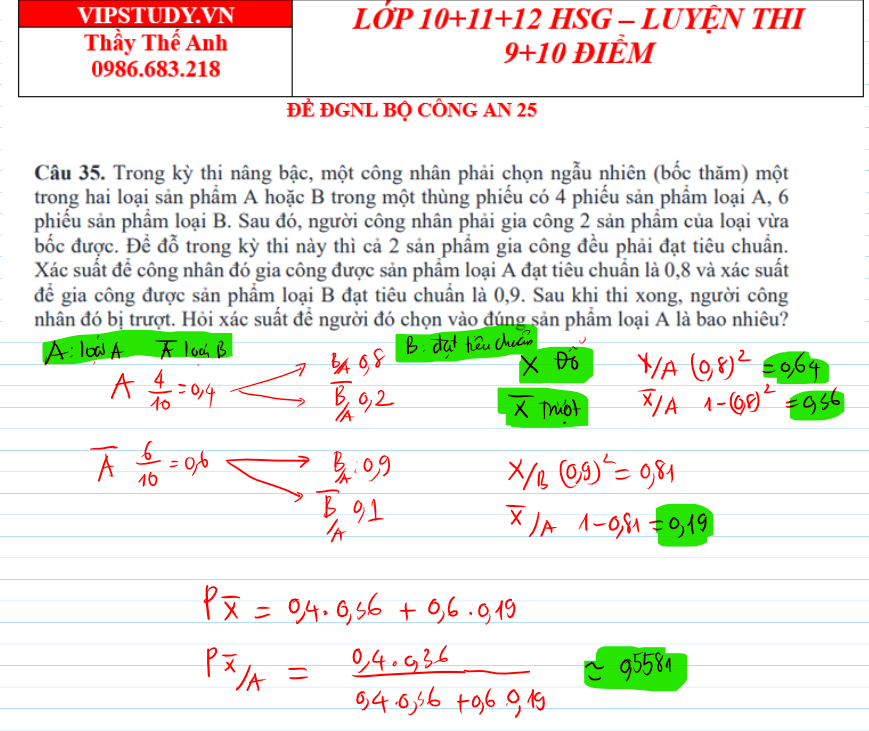 Xác suất để công nhân đó gia công được sản phẩm loại A đạt tiêu chuẩn là 0,8 và xác suất để gia công được sản phẩm loại B đạt tiêu chuẩn là 0,9. Sau khi thi xong, người công nhân đó bị trượt. Hỏi xác suất để người đó chọn vào đúng sản phẩm loại A là bao nhiêu?
