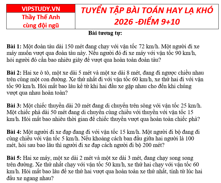 Bài 1: Một đoàn tàu dài 150 mét đang chạy với vận tốc 72 km/h. Một người đi xe máy muốn vượt qua đoàn tàu này. Nếu người đó đi xe máy với vận tốc 90 km/h, hỏi người đó cần bao nhiêu giây để vượt qua hoàn toàn đoàn tàu?