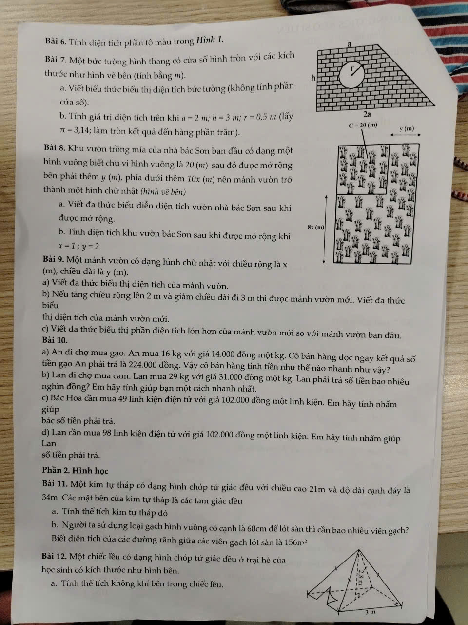 Một kim tự tháp có dạng hình chóp tứ giác đều với chiều cao 21m và độ dài cạnh đáy là 34m. Các mặt bên của kim tự tháp là các tam giác đều.