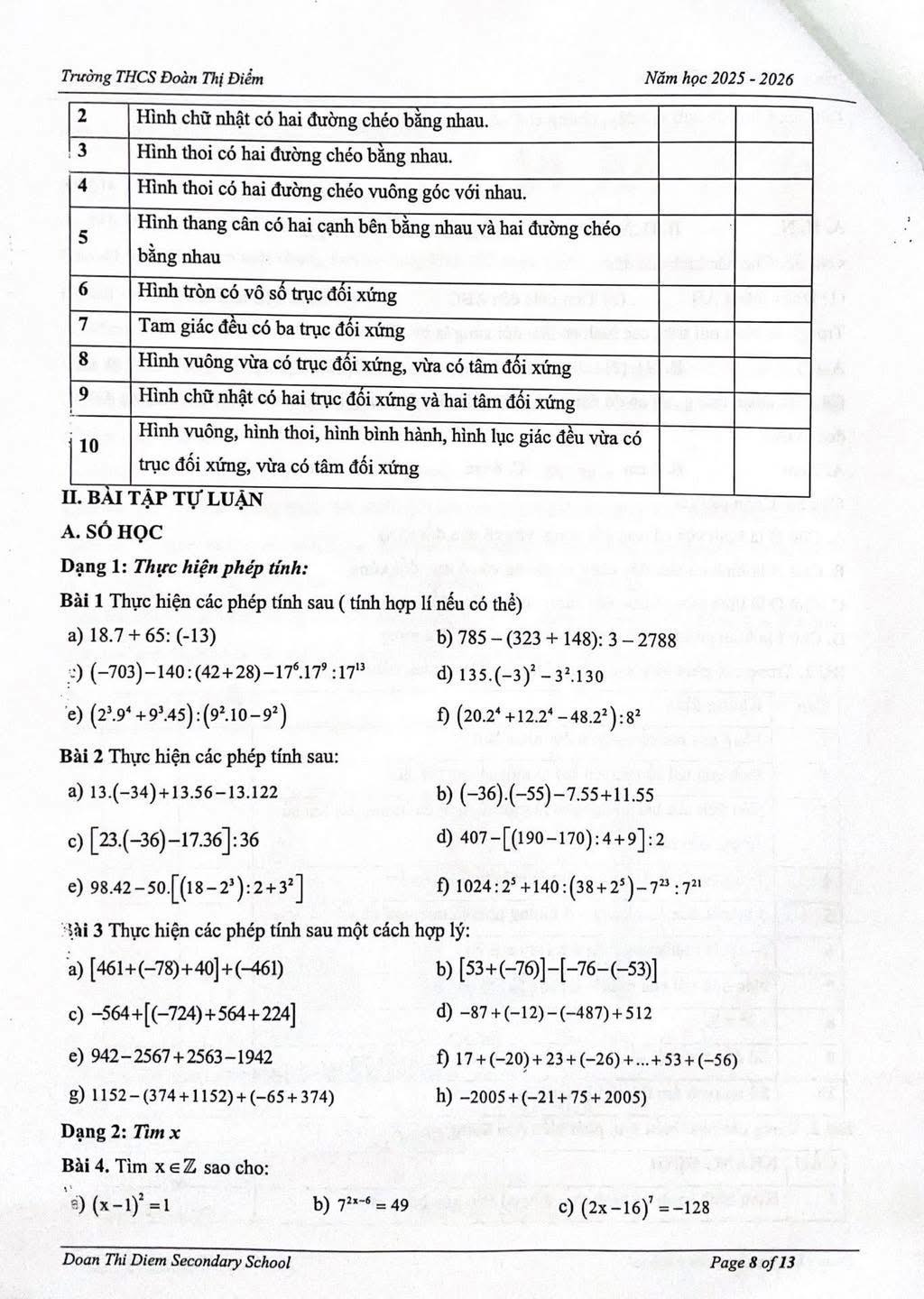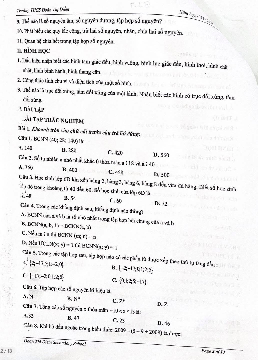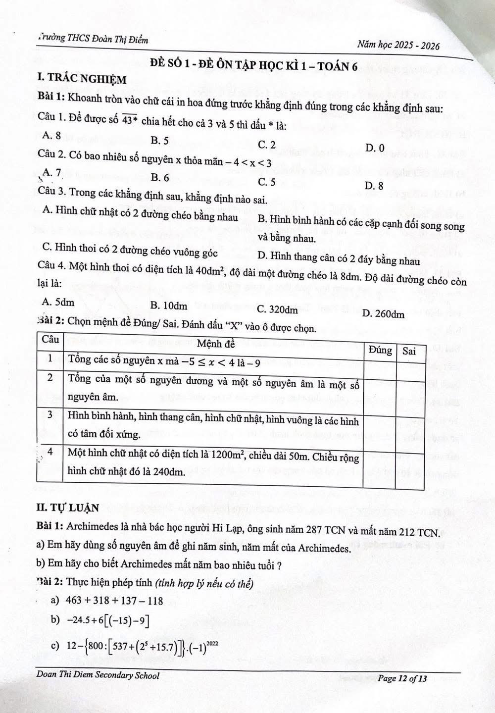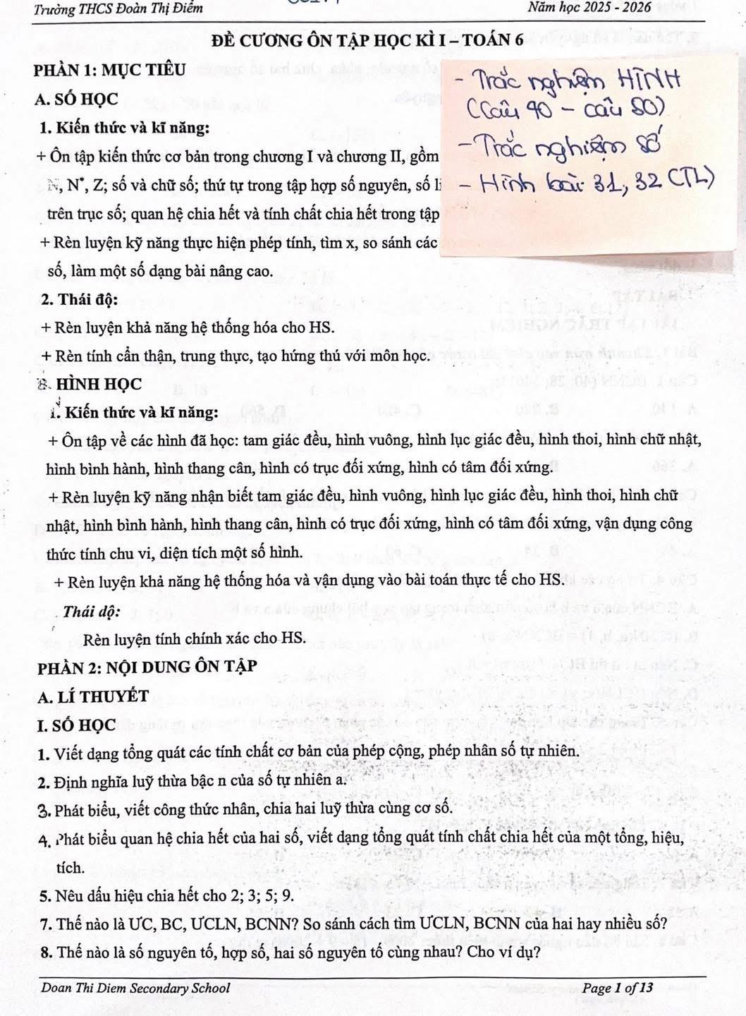 Đề cương hk1 lớp 6 Đoàn thị điểm 2025