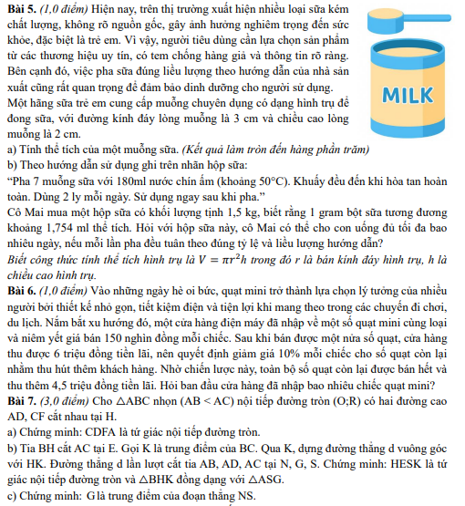 Bài 5. (1,0 điểm) Hiện nay, trên thị trường xuất hiện nhiều loại sữa kém chất lượng, không rõ nguồn gốc, gây ảnh hưởng nghiêm trọng đến sức khỏe, đặc biệt là trẻ em. Vì vậy, người tiêu dùng cần lựa chọn sản phẩm từ các thương hiệu uy tín, có tem chống hàng giả và thông tin rõ ràng. Bên cạnh đó, việc pha sữa đúng liều lượng theo hướng dẫn của nhà sản xuất cũng rất quan trọng để đảm bảo dinh dưỡng cho người sử dụng. Một hãng sữa trẻ em cung cấp muỗng chuyên dụng có dạng hình trụ để đong sữa, với đường kính đáy lòng muỗng là 3 cm và chiều cao lòng muỗng là 2 cm.