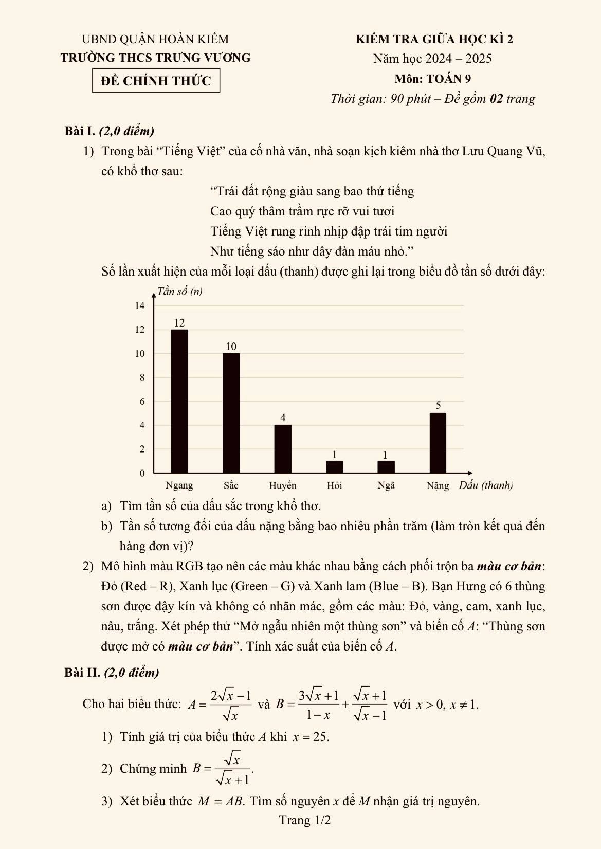 Đề toán 9 gk2 Trưng Vương Hà Nội