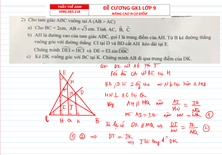 c) Kẻ DK vuông góc với BC tại K Chứng minh AB đi qua trung điểm của DK.