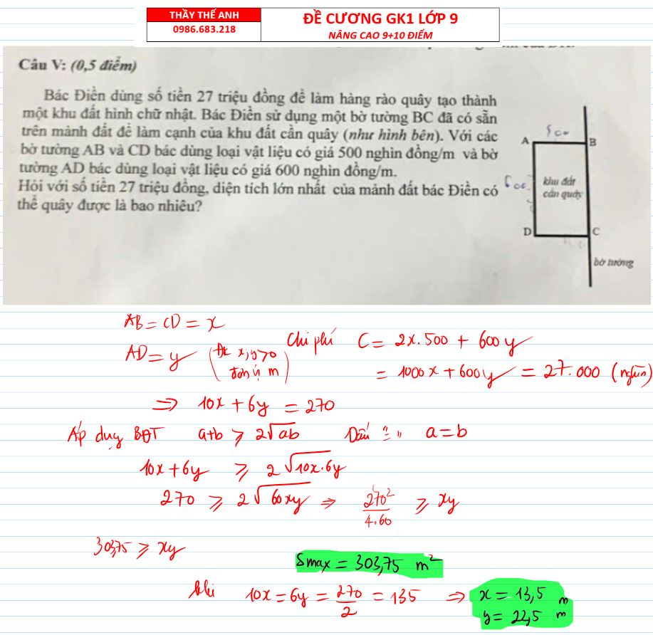 Bác Điền dùng số tiền 27 triệu đồng để làm hàng rào quay tạo thành một khu đất hình chữ nhật. Bác Điền sử dụng một bờ tường BC đã có sẵn trên mảnh đất để làm cạnh của khu đất cần quay (như hình bên). Với các bờ tường ABvà CD bác dùng loại vật liệu có giá 500 nghìn đồng/m và bờ tường AD bác dùng loại vật liệu có giá 600 nghìn đồng/m.