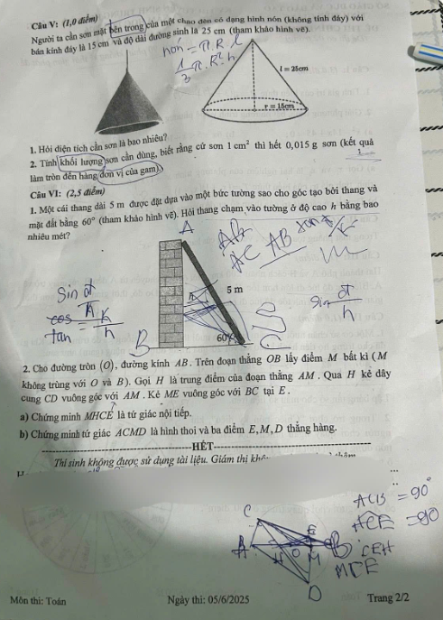 2. Cho đường tròn (O), đường kính AB. Trên đoạn thẳng OB lấy điểm M bất kỳ (M không trùng với O và B). Gọi H là trung điểm của đoạn thẳng AM. Qua H kẻ dây CD vuông góc với AM. Kẻ ME vuông góc với BC tại E.