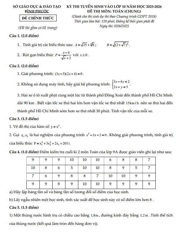 Trích dẫn Đề tuyển sinh lớp 10 môn Toán (chung) năm 2025 – 2026 sở GD&ĐT Bình Phước: