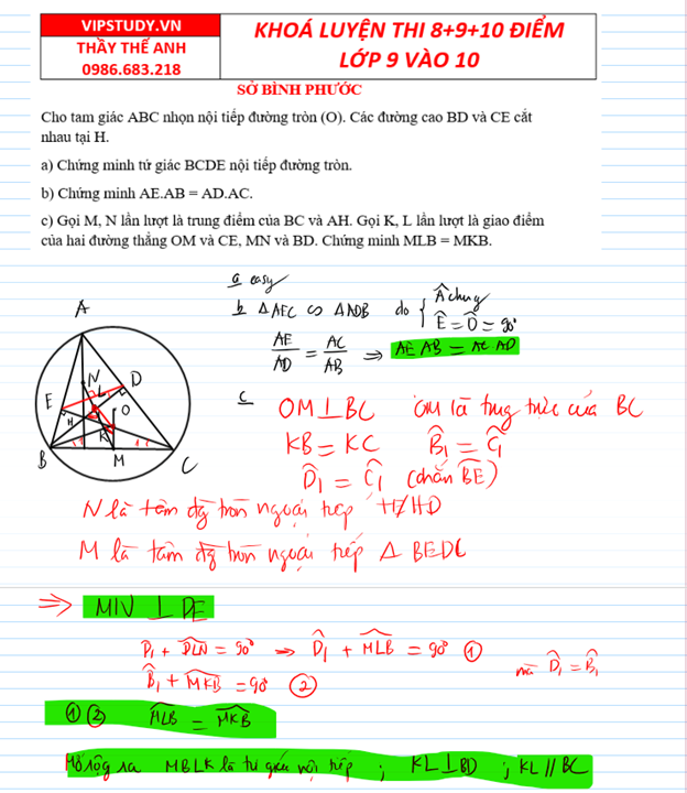 + Cho tam giác ABC nhọn nội tiếp đường tròn (O). Các đường cao BD và CE cắt nhau tại H. a) Chứng minh tứ giác BCDE nội tiếp đường tròn. b) Chứng minh AE.AB = AD.AC. c) Gọi M, N lần lượt là trung điểm của BC và AH. Gọi K, L lần lượt là giao điểm của hai đường thẳng OM và CE, MN và BD. Chứng minh MLB = MKB.