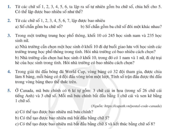 Bài 1 trang 10 Toán lớp 10 Cánh diều Tập 2: Từ các chữ số 1, 2, 3, 4, 5, 6, ta lập ra số tự nhiên gồm ba chữ số, chia hết cho 5. Có thể lập được bao nhiêu số như thế?